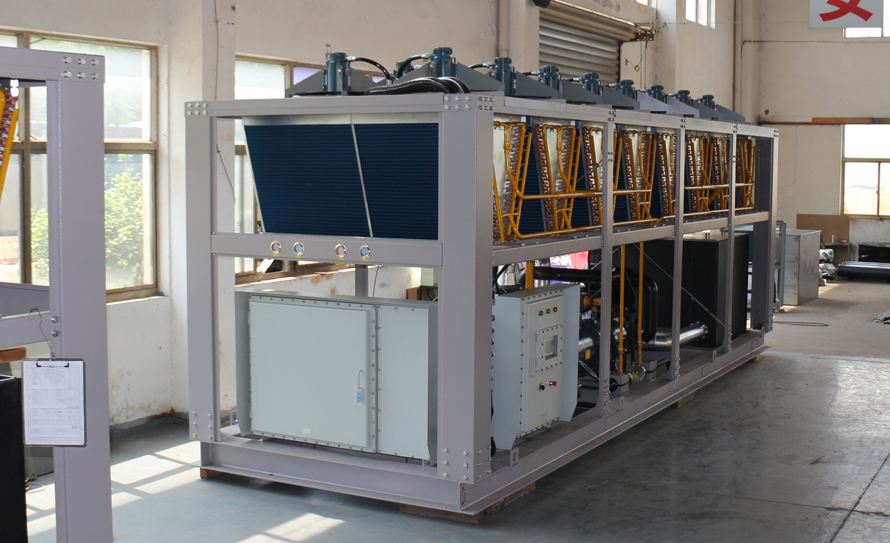 1、以乙二醇為載冷劑的風冷螺桿式防爆低溫制冷機組;